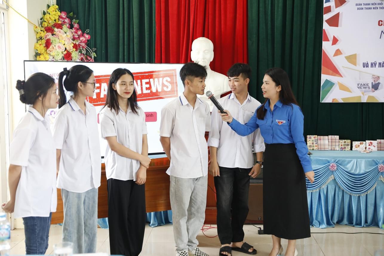 | Đoàn viên thanh niên TTXVN hướng dẫn cách phân biệt tin giả cho các em học sinh Trung tâm Giáo dục nghề nghiệp - Giáo dục thường xuyên huyện Thanh Thuỷ, tỉnh Phú Thọ, ngày 10/5 |