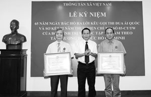 * Trong buổi lễ, hai đồng chí Mai Quang Huy, Phó Bí thư chuyên trách Đảng ủy TTXVN và Đàm Hiếu Dũng, Giám đốc Trung tâm Kỹ thuật thông tấn vinh dự được nhận phần thưởng cao quý của Đảng, Nhà nước: Huân chương Lao động hạng Nhì. Mười hai tập thể, cá nhân có thành tích xuất sắc trong phong trào thi đua của ngành giai đoạn 2008 - 2012 được trao Bằng khen của Tổng Giám đốc TTXVN. Đảng ủy TTXVN cũng khen thưởng 26 tổ chức cơ sở đảng, đảng viên có thành tích xuất sắc trong Học tập và làm theo tấm gương đạo đức Hồ Chí Minh giai đoạn 2011 - 2013.