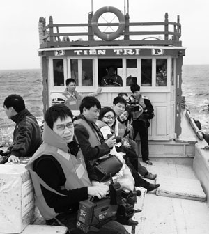 Nữ PV Quỳnh Anh ( người đeo kính) của Việt Nam News cùng các đồng nghiệp trên thuyền nhỏ vào đảo Lý Sơn