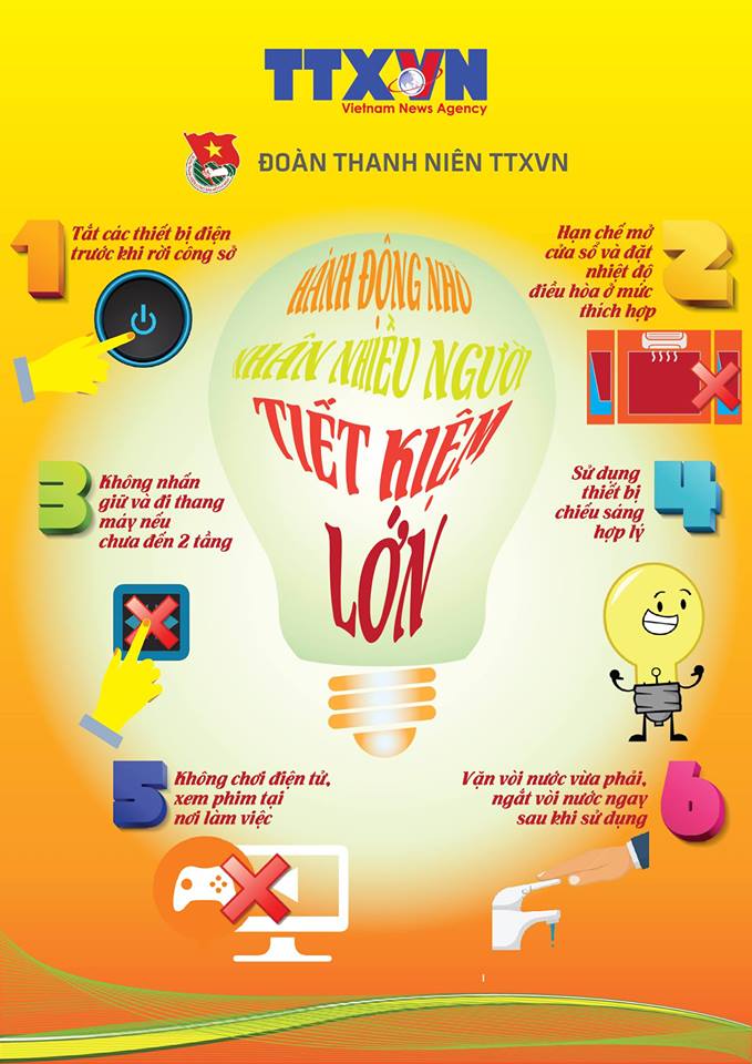 * Ban Thường vụ Đoàn thanh niên cơ quan vừa triển khai cuộc vận động “Tuổi trẻ thông tấn thực hành tiết kiệm điện, nước - Vì sự phát triển bền vững của TTXVN”. Cuộc vận động nhằm nâng cao nhận thức, phát huy tinh thần xung kích của đoàn viên thanh niên trong việc sử dụng và tiết kiệm điện, nước; xây dựng các mô hình nhóm thanh niên sử dụng tiết kiệm điện, nước tiêu biểu.