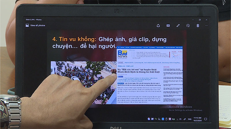 Ngoài trang bị kỹ năng nhận diện tin giả, chương trình còn có một nội dung quan trọng khác là giới thiệu cho học sinh cách tra cứu thông tin chuẩn xác từ những kênh thông tin chính thống, tin cậy của TTXVN, thông qua một số ví dụ tin bài cải chính fake news trên Kênh truyền hình Thông tấn, báo điện tử VietnamPlus, báo Tin tức, báo Thể thao và Văn hóa... Sau khi có được những hiểu biết cơ bản về fake news, các em đã có đủ cơ sở và sự tự tin để bàn luận về những cách mà học sinh có thể làm để ngăn chặn sự lây lan của tin giả.
