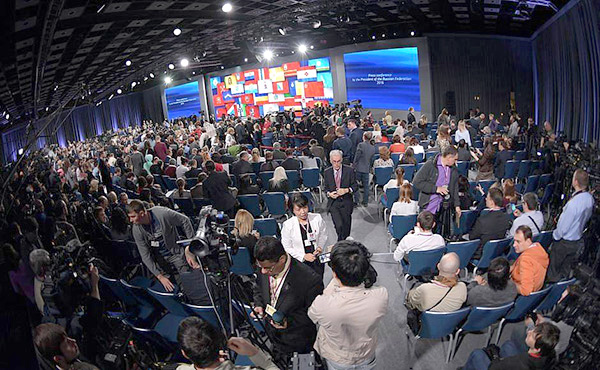 | Phóng viên Tâm Hằng dẫn hiện trường tại cuộc họp báo lớn của Tổng thống Nga V.Putin, tháng 12/2016 |