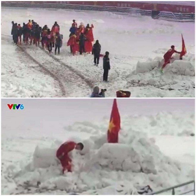 Số là trước khi rời sân, Duy Mạnh đã lấy một lá cờ cắm trên đụn tuyết cao được các nhân viên dọn dẹp vun ở góc sân. Trước khi rời đi, Duy Mạnh đã cúi đầu chào lá quốc kỳ rồi mới cùng đồng đội và các cổ động viên về khách sạn.