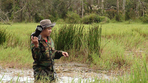Lội xuống khu sình lầy rộng khoảng hai hécta, nếu không muốn hỏng máy ảnh, máy quay phải tuân thủ theo đúng chỉ dẫn. Vậy là tôi giơ máy ảnh cao qua đầu, chân lội dưới nước ngập ngang ngực. Người đi trước bước vào đâu thì người sau đi đúng chỗ đó, giữ khoảng cách không quá xa để nếu ai tụt xuống hố thì người khác còn ứng cứu kịp thời. Đỉa thấy hơi người nên bủa vây. Đi được một lúc thấy chân vừa ngứa vừa buồn, biết là đỉa bám nhưng đành chịu. Đi cố đến một gốc cây tôi đưa chân lên mặt nước, nhờ đồng nghiệp gỡ con đỉa ra khỏi chân. Chuyến đi nhớ đời, các anh trong Ban quản lý thừa nhận lần đầu tiên có nhà báo dám xuống sình lầy ghi hình.