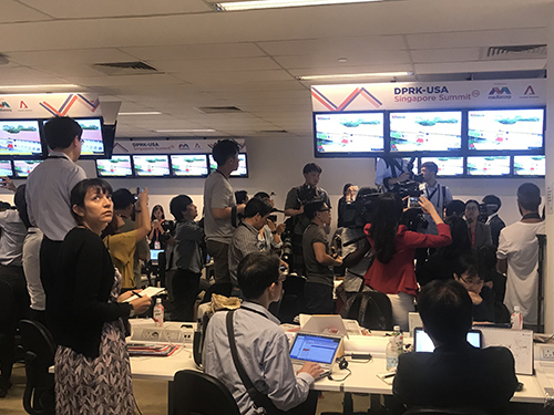 Đúng 10 giờ sáng 10/6, Trung tâm báo chí phục vụ cuộc gặp thượng đỉnh chính thức mở cửa đón phóng viên từ khắp nơi trên thế giới, trong đó có các hãng tin lớn như: Reuters, AFP, AP, CNN, BBC... Để có được tấm thẻ tác nghiệp chính thức, các phóng viên đều phải trải qua quá trình đăng ký rất khó khăn và kiểm duyệt phức tạp của Bộ Thông tin Truyền thông Singapore.