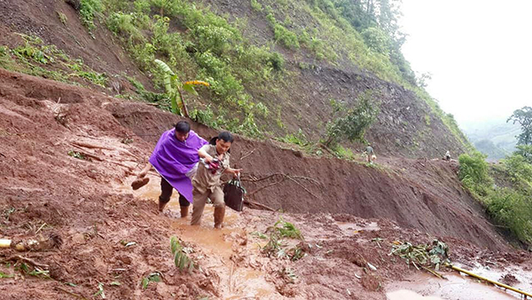 | Trưởng CQTT Lai Châu Trần Văn Hoàng (phía trước) và đồng nghiệp vượt qua một điểm sạt lở trên đường vào xã Tả Ngảo, huyện Sìn Hồ, tỉnh Lai Châu, tháng 6/2018 |