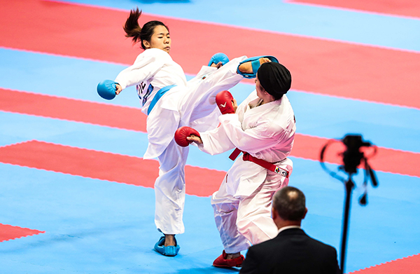 | Khoảnh khắc VĐV karate Nguyễn Thị Ngoan ra đòn trong trận tranh huy chương Đồng nội dung Kumite |