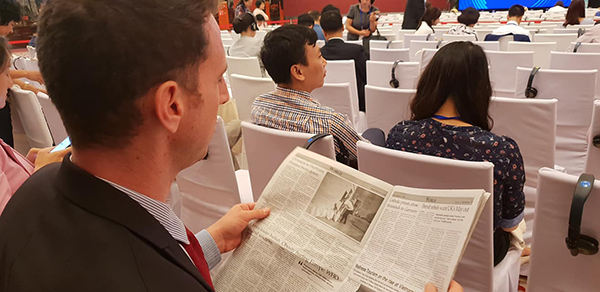 | Đại biểu tham dự WEF ASEAN 2018 đọc báo Việt Nam News |