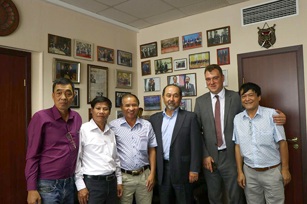 | Phó tổng biên tập Marat Abulkhtin, Trưởng phòng quan hệ quốc tế Sergey Kitsenko (thứ ba và thứ hai bên phải) và các thành viên trong đoàn cán bộ, phóng viên TTXVN tại trụ sở hãng thông tấn TASS |