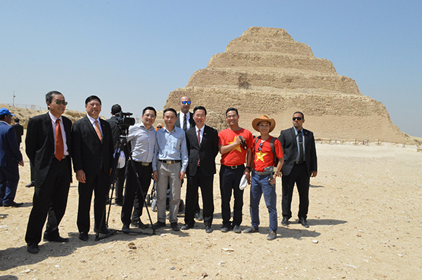 | Đồng chí Võ Văn Thưởng cùng đoàn công tác và PV Trương Anh Tuấn (thứ ba bên trái) tại chân Kim tự tháp |