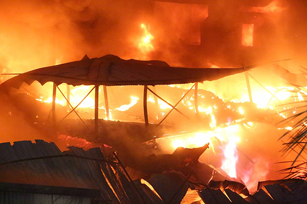 Khu nhà xưởng bị cháy có hai tầng, được làm bằng khung sắt, mái lợp tôn, nên khi gặp nhiệt độ cao đã bị sập đổ một phần khiến việc tiếp cận chữa cháy gặp khó khăn. Nhiều tấm tôn cháy đỏ rực bỗng sụp xuống che lấp điểm lửa, làm cho vòi rồng khó phun nước trực tiếp vào điểm cháy. Lực lượng cứu hỏa nhanh chóng phá tường bao để khống chế lửa. Tuy nhiên, đám cháy vẫn ngùn ngụt.