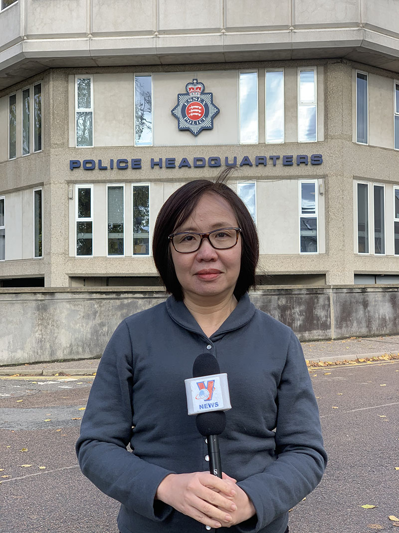 | Phóng viên Diễm Quỳnh, Trưởng CQTT TTXVN tại London (Vương quốc Anh), đưa tin từ hạt Essex, ngày 7/11 |