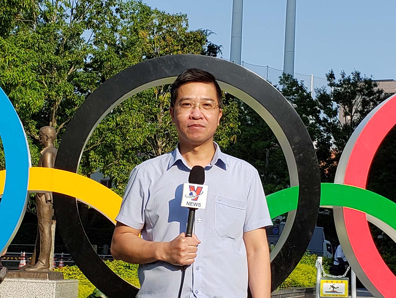 | Trưởng CQTT TTXVN tại Tokyo (Nhật Bản) Đào Thanh Tùng dẫn hiện trường đưa tin Olympic 2020, tháng 7/2021 |