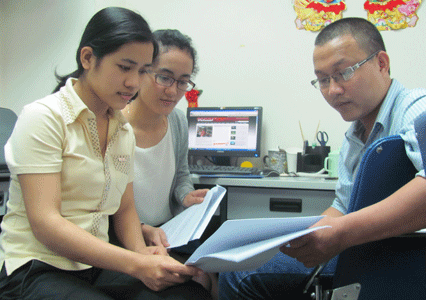 Nhóm phóng viên báo điện tử VietnamPlus vừa đoạt giải A Giải báo chí TTXVN 2010 với chùm bài 'Lái đò thời @: Tròng trành thuyền chở chữ tâm'. Từ trái qua: Tác giả Phạm Mai, Hồng Kiều và Sơn Bách |