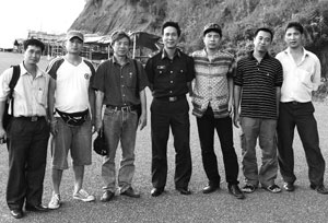 Nhóm phóng viên TTXVN và chỉ huy Đồn Biên phòng A pa chải tại Ngã ba Đông Dương (tác giả đứng thứ hai bên phải) |
