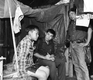 Nhà báo Nguyễn Quang Vinh (đứng) và Trưởng phân xã Điện Biên Chu Quốc Hùng phỏng vấn người dân tại bản Huổi Khon |