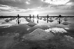 | “Người dân thu hoạch muối lúc mặt trời lặn ở huyện Ninh Hòa, tỉnh Khánh Hòa” của Hoàng Giang Hải |
