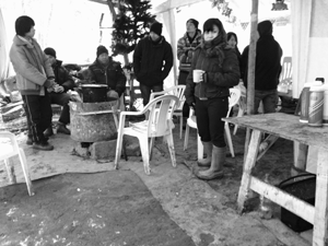Nhà báo Nguyễn Thu Hà (người cầm cốc) trong khu lều trại của những người Việt nhập cư bất hợp pháp |