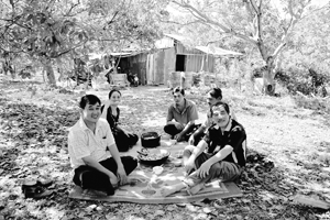 Phóng viên Kim Sơn và Hữu Thành (bên trái - Báo ảnh Việt Nam) dùng cơm trưa ở vườn điều ở trang trại Tuấn Bông (Bình Phước) khi thực hiện phóng sự ảnh "Quả Điều Vàng" |