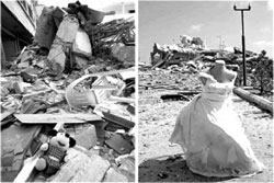 Một kiểu gian lận khác rất dễ nhận thấy nhưng không dễ chứng minh. Đó là những bức ảnh có bố cục và ý tưởng "đẹp" tới mức PV ảnh nào cũng thèm muốn. Đơn cử: Để diễn tả sự tàn khốc của chiến tranh, không gì dễ bằng đặt những đồ vật biểu tượng cho hạnh phúc trong một bối cảnh đổ nát, hoang tàn, chẳng hạn một chiếc áo cưới hay đồ chơi (ảnh 5-6).