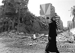 Còn chú thích của bức ảnh số 8: "Một phụ nữ Libăng vừa nhìn lên bầu trời vừa đi ngang qua một tòa nhà bị san phẳng sau trận ném bom qua đêm của Israel vào ngoại ô Beirut ngày 5-8-2006 (Adnan Hajj/Reuters)".