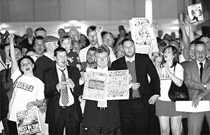 Hai trăm PV, BTV tòa soạn "News of the World" bên ngoài trụ sở tại Luân Đôn (Anh) với số báo cuối cùng gửi lời "Cảm ơn và tạm biệt" tới 7,5 triệu độc giả trong tháng sau 168 năm tồn tại