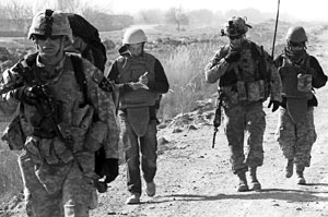 PV Chris Torchia của hãng AP (thứ hai bên trái) ghi chép khi đi cùng với các lính Mỹ thuộc Tiểu đoàn 4, Trung đoàn bộ binh 23, Lữ đoàn 5, Sư đoàn bộ binh 2 trong một chuyến tuần tra hôm 15/2/2013 ở khu vực Badula Qulp, phía Tây Lashkar Gah, tỉnh Helmand, miền Nam Afghanistan |