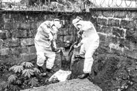 Giải nhất hạng mục Câu chuyện tin tức tổng hợp: hình ảnh về dịch bệnh Ebola ở Tây Phi (ảnh 5). Đội ngũ nhân viên trong ảnh đang cố đưa một người đàn ông trở về Trung tâm điều trị cách li Hastings Ebola ở thủ đô Freetown, nước Sierra Leone. Được biết, nhân vật đã rất hoảng sợ, cố thoát khỏi khu điều trị và chết ngay sau khi nhiếp ảnh gia Pete Muller chụp bức ảnh vào ngày 23/11/2014.