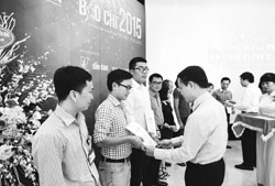 Tổng giám đốc TTXVN Nguyễn Đức Lợi trao giải A cho các tác giả đoạt giải |
