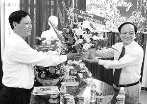 Trưởng phân xã Bình Định Nguyễn Viết Ý (bên trái) nhận hoa chúc mừng của đ/c Nguyễn Văn Thiện, Ủy viên Trung ương Đảng, Bí thư Tỉnh ủy Bình Định, nhân Ngày Báo chí cách mạng Việt Nam 21/6/2011
