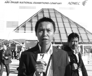 Tác giả Vũ Hội tác nghiệp trước Trung tâm hội nghị quốc tế Excel London |