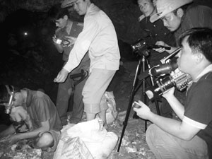 Phóng viên Mạnh Hà (người đội mũ), PX Cao Bằng đang ghi hình tại bãi khai thác vàng Khau Kiểm, huyện Thạch An, Cao Bằng |
