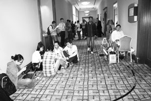 Các nhà báo nghỉ ngơi và tác nghiệp ngay tại hành lang khách sạn |