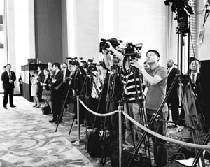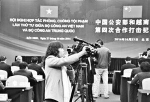 Trưởng CQTT Hà Tường Thu tác nghiệp tại một hội nghị song phương