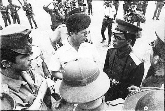 | Phóng viên VNTTX Nguyễn Như Kim (người mang máy ảnh) đang phỏng vấn đại biểu Canada trong Ủy ban quốc tế về việc giám sát rút quân Mỹ năm 1973 |
