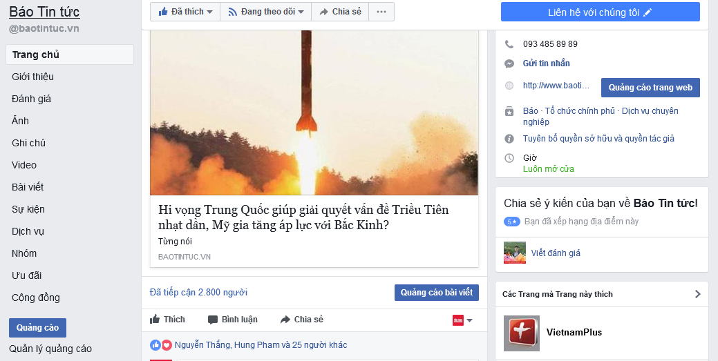 | Trang Fanpage của báo Tin tức trên Facebook |