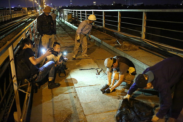 | Phóng viên VietnamPlus tác nghiệp tại cầu Long Biên, Hà Nội |