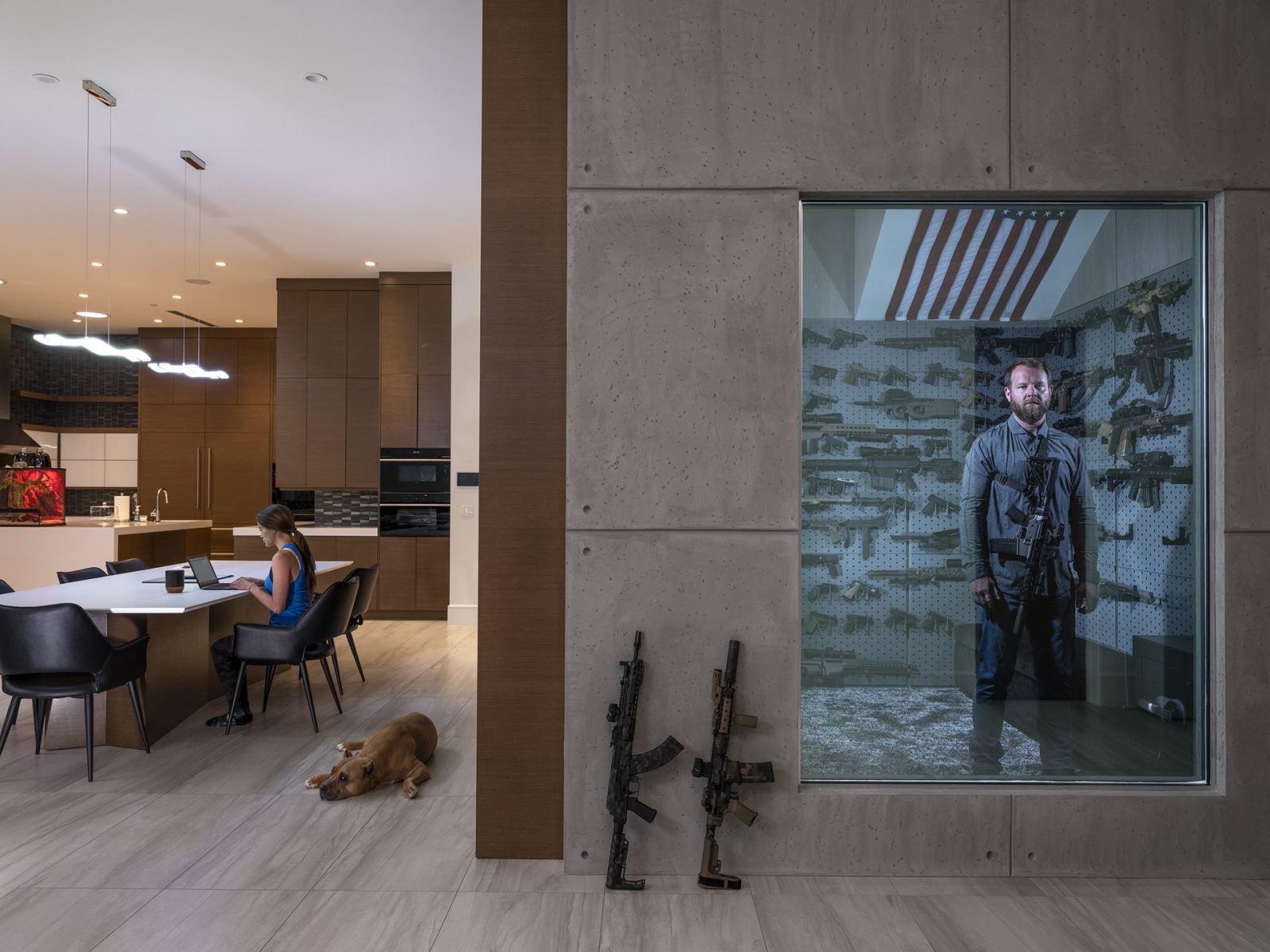 Nhiếp ảnh gia tự do Gabriele Galimberti giành giải Nhất, hạng mục Chân dung với bức ảnh chụp Robert Baldwin Jr. đứng trong phòng trữ súng bí mật của mình ở nhà riêng tại Las Vegas, Nevada trong khi bạn gái Tori làm việc ngay cạnh, tháng 4/2019 (ảnh dưới). Robert Baldwin có thói quen mua súng làm quà tặng cho bản thân mình vào mỗi dịp sinh nhật hoặc khi có chuyện vui.