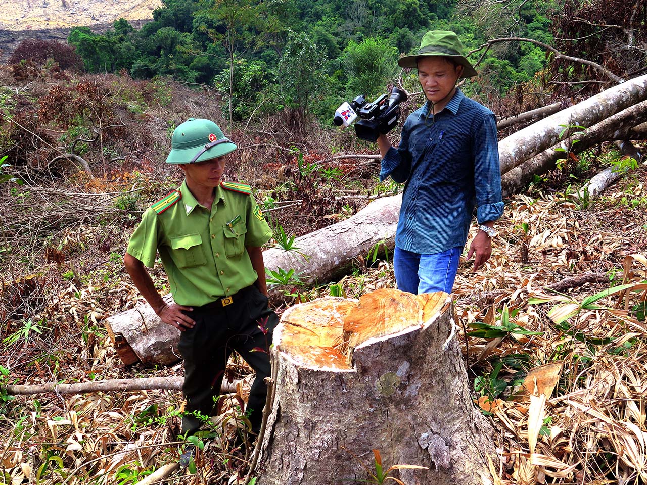 | Phóng viên Hà Linh tại hiện trường vụ phá rừng An Lão, tỉnh Bình Định,tháng 9/2017 |