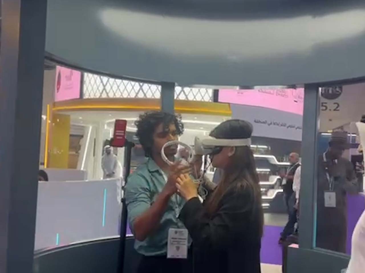 Các phóng viên Phương Anh, Thu Lan và Xuân Phong, Ban biên tập tin Đối ngoại, tham quan triển lãm công nghệ truyền thông tại Đại hội truyền thông toàn cầu 2022