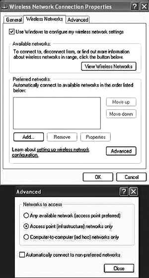 Nếu như bạn lo lắng về vấn đề này, có một số bước có thể áp dụng bao gồm việc vô hiệu hoá các kết nối tự động và sử dụng một tên duy nhất cho mạng nhà bạn. Vào phần Wireless Networks, kích nút "Advance" và bỏ tuỳ chọn "Access point (infrastructure) networks only"