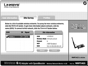 Mỗi bộ điều hợp không dây đều có phần mềm hiển thị trên màn hình nhưng thỉnh thoảng bạn phải tìm nó trên ổ cứng. Trên ảnh chụp màn hình dưới đây, máy tính sử dụng phần mềm hiển thị Linksys trên màn hình và thấy được mạng không dây đang được truyền phát trên kênh nào cùng với các thông tin khác như loại mã hóa nào đang được sử dụng và địa chỉ MAC của điểm truy cập.