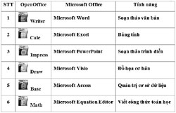 OpenOffice bao gồm 06 thành phần cơ bản tương ứng với 06 tính năng: Writer, Calc, Impress, Draw, Base và Math. Để người dùng rõ hơn về tính năng của các thành phần, dưới đây là bảng so sánh giữa OpenOffice và Microsoft Office: