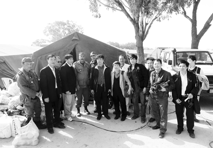 Phóng viên Nhan Sáng (thứ năm bên phải) cùng các quan chức của LHQ, Tuynidi và các đồng nghiệp Việt Nam tại khu trại tị nạn ở biên giới Tuynidi |