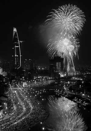 Phóng viên chụp ảnh bắn pháo hoa đêm giao thừa thì trước giao thừa hai tuần đã phải suy nghĩ, quan sát, tìm tòi những điểm cao trong thành phố, thảo luận với đồng nghiệp... để có những điểm chụp đẹp nhưng không trùng lặp với những năm trước. Rồi việc viết công văn, liên hệ để đảm bảo chỗ chụp 15 phút pháo hoa cũng không kém phần nhiêu khê. Trước "giờ G" 1 - 2 tiếng, PV đã lỉnh kỉnh máy móc, chân máy tập trung tại điểm đã định. Nhưng đôi khi "không hẹn mà gặp", có đến mười mấy ông phóng viên ảnh cùng tập trung trên sân thượng của một tòa nhà. Dàn máy được sắp ra, ống ngắn, ống dài nom như dàn súng phòng không bảo vệ trời đêm thành phố. Sau khi thử máy, thảo luận rôm rả về điểm bắn, góc độ... thế nào cũng có một khoảng lặng. Đó là lúc các "pháo thủ", trong không khí se lạnh và lộng gió, ngắm nhìn thành phố rực rỡ ánh đèn trong đêm ba mươi, chợt nhớ những người thân đang quây quần bên bữa cơm đón giao thừa. Khi tiếng pháo hoa rền vỡ bầu trời, các PV vội vã lao vào công việc. Ai cũng mong muốn có được những bức ảnh tốt nhất, đẹp nhất trong những phút đầu tiên của năm mới. Khi đợt pháo hoa cuối cùng kết thúc, mọi người nhanh chóng thu gọn máy móc, vội vã chúc Tết, giã biệt nhau rồi mỗi người mỗi ngả, nhanh chóng tìm điểm thuận lợi gửi ảnh về cơ quan, tòa soạn.