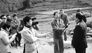 Phóng viên Viết Tôn (thứ hai từ trái sang) tác nghiệp tại xã vùng cao Phố Là, huyện Đồng Văn (Hà Giang) |