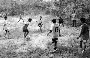 Sân bóng 'dã chiến' giữa núi rừng Lò Gò - Xa Mát, nơi diễn ra trận giao hữu giữa thanh niên B2 và các chiến sĩ Đồn Biên phòng 831 |