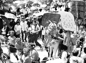 Cái nắng chói chang, cái nóng như thiêu như đốt của tiết trời tháng 5, cộng thêm chiếc ba lô máy ảnh hơn 20kg vác trên vai, dù là PV ảnh to khỏe như tôi cũng không tránh được tình trạng thở không ra hơi. Vậy mà những đội quân diễu binh của nhà các ông Hiệu, từ nhỏ (6,7 tuổi) đến lớn, cứ diễu hành qua diễu hành lại giữa trời nắng oi bức, mà không một chút kêu ca; thậm chí có những bé trai say nắng bị ngất, phải đưa về nhà, sau khi tỉnh lại đòi bố mẹ đưa ra bằng được để tiếp tục diễu binh, tôi thấy sao mà kỳ lạ. "Hóng hớt" được câu chuyện các cụ già nơi đây, rằng "chúng nó đều được Thánh chọn cả đấy, nên dù ốm nặng đến mấy, đến ngày hội cũng tự dưng khỏi bệnh". Nghe thì không hiểu lắm nhưng chỉ có điều, chúng tôi thấy vậy, lại vác balô lên vai tiếp tục "tác chiến", quên đi hết mệt mỏi.