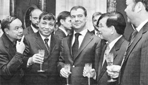 Phóng viÃên ÄÃơnh Lanh (ngoà i cÃạng bÃên trÃĂi) tÃĂc nghiỏằ‡p trong chuýº¿n thăm LB Nga cỏằĐa ChỏằĐ tỏằ‹ch nặ°ỏằ›c Nguýằ…n Minh Triỏº¿t |