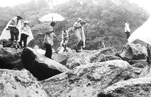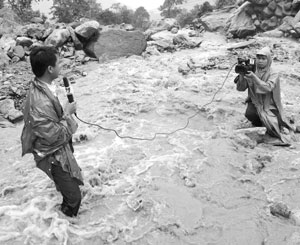3. "Tai qua nạn khỏi" các phóng viên Cơ quan thường trú TTXVN ở Lào Cai nhanh chóng tiếp cận hiện trường vùng lũ và khẩn trương tác nghiệp. Ảnh: Nhà báo Lục Văn Toán (người cầm máy ảnh) ghi lại những hình ảnh kinh hoàng tại vùng rốn lũ Bản Khoang..